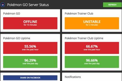 Meanwhile, the Pokémon Go Server Status is more simple. It uses a traffic light colour scheme to show whether the server is online or not, or if it's unstable. It also shows the uptime performance over the past hour, and day.